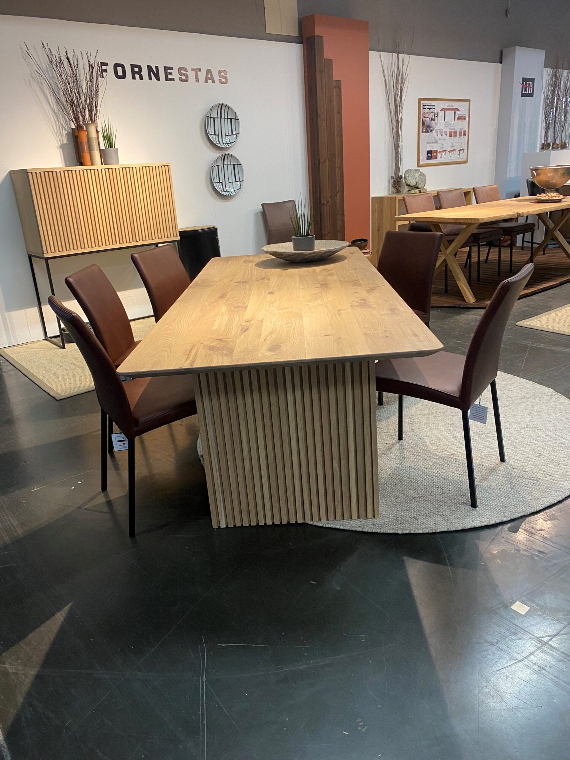 Du får dessutom möjlighet att skräddarsy bordets hörn & kantprofil och filler, vilket gör att du kan skapa en unik och personlig möbel som verkligen speglar din stil. De massiva ribborna i underredet framhäver de vackra, naturliga skiftningarna i träet och bidrar med en varm och inbjudande atmosfär till varje måltid.